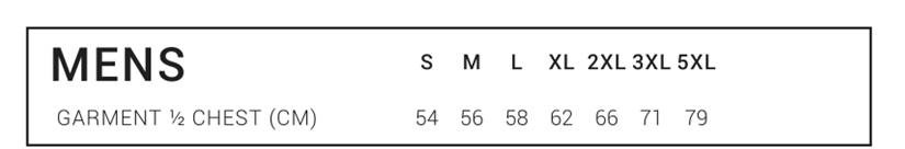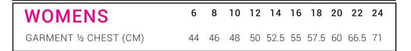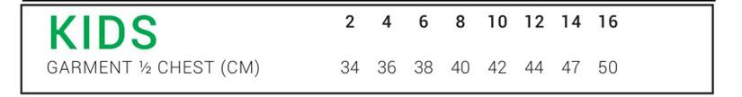 Please note that the half measurements are when the shirt is laying flat on a table – the most accurate way to get a size match is to have the students place a t-shirt that fits them on a table and measure it across the chest (just below the sleeves), then match this size up to the size chart.