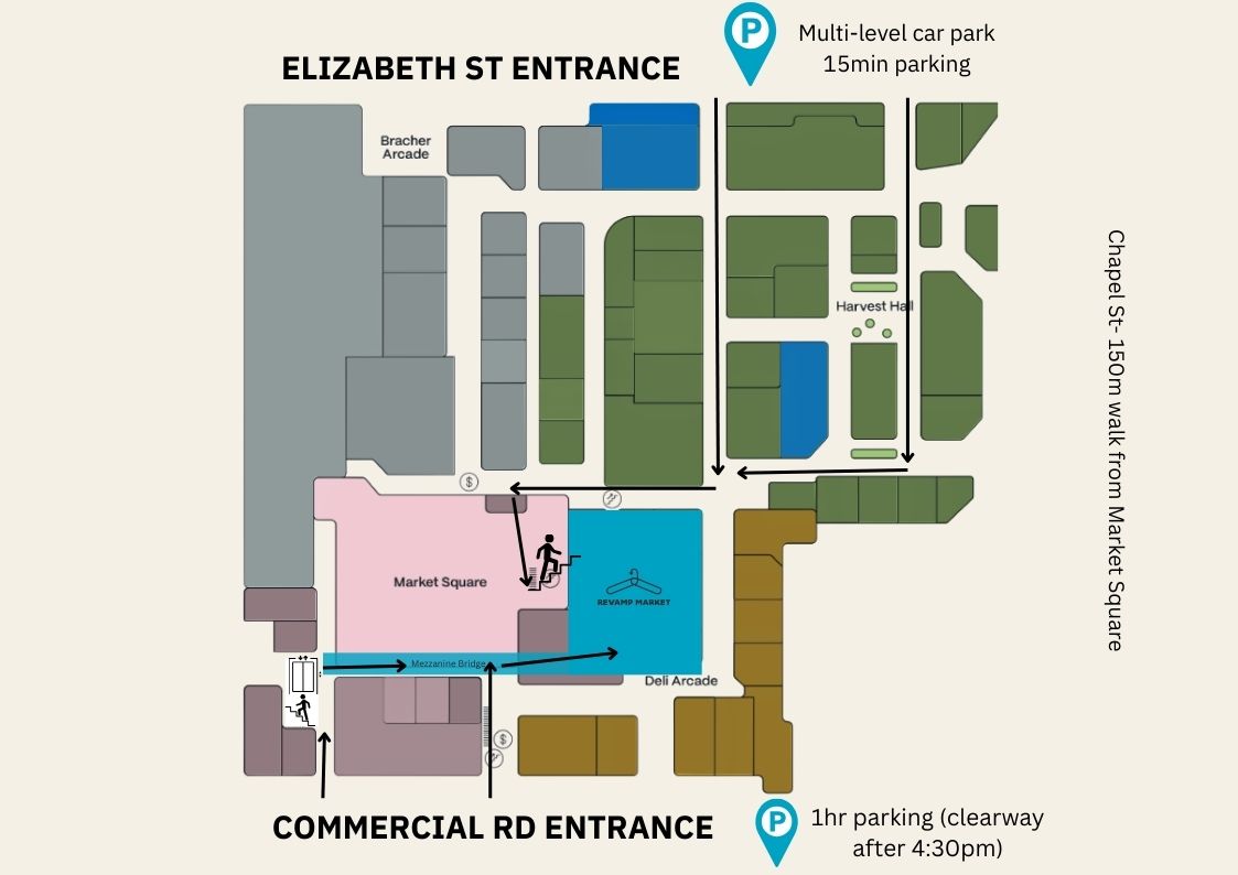 - Stalls will be located undercover on the upper-level mezzanine a floor above market square.