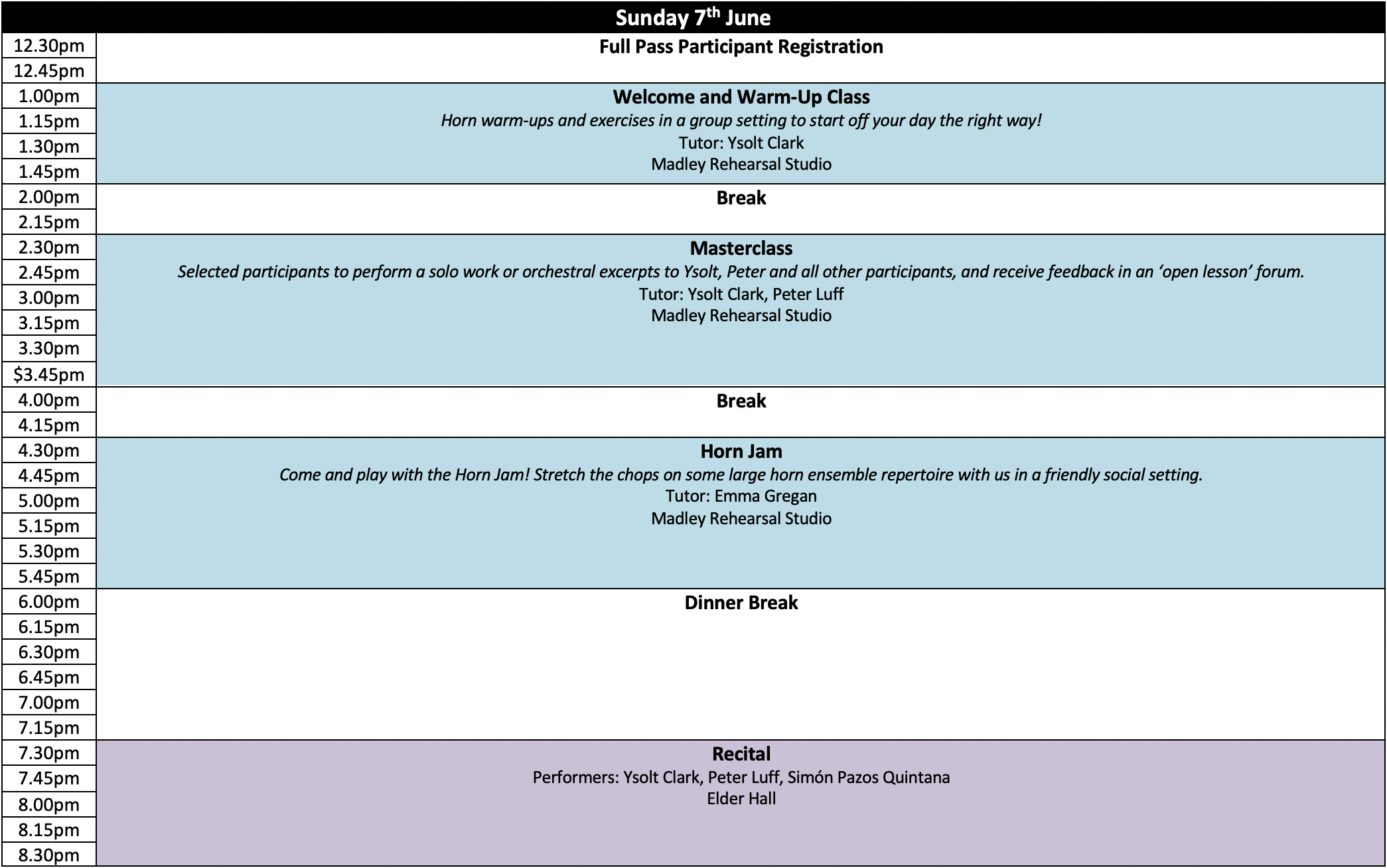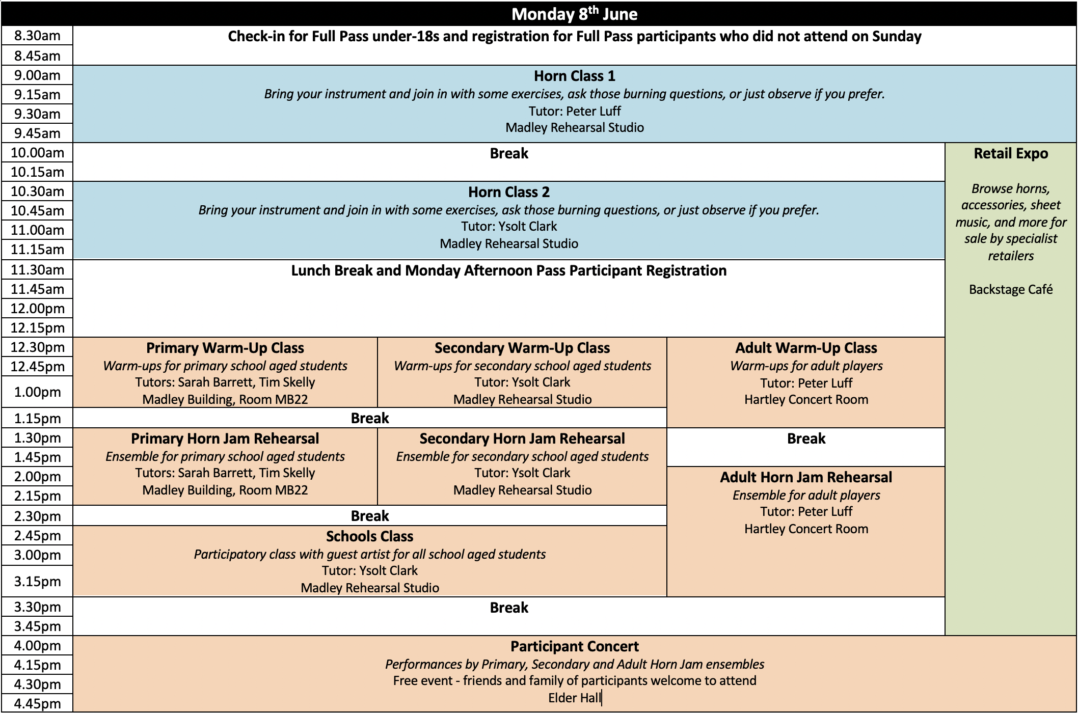 - Full Pass (Adult/Concession/Child) - This is an all-access pass to every session of the event, including the recital, across the Sunday and Monday (blue, purple, orange, green). This pass is suitable for horn players only.