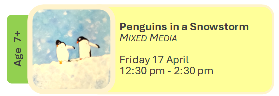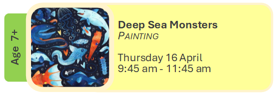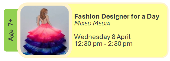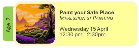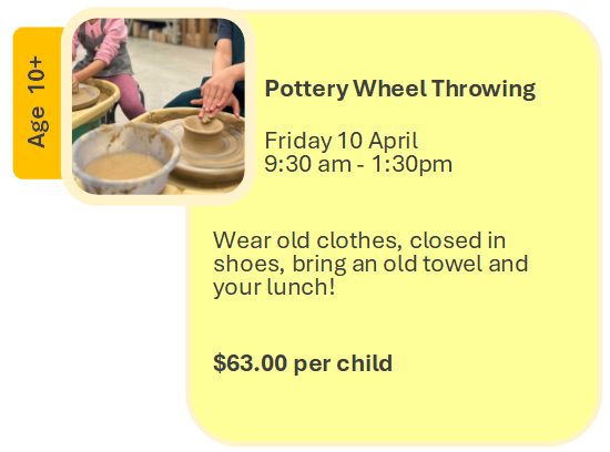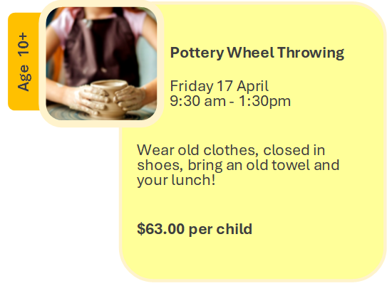 Art can be messy, please wear old clothes, closed in shoes and bring an old towel. All materials supplied. BYO lunch.