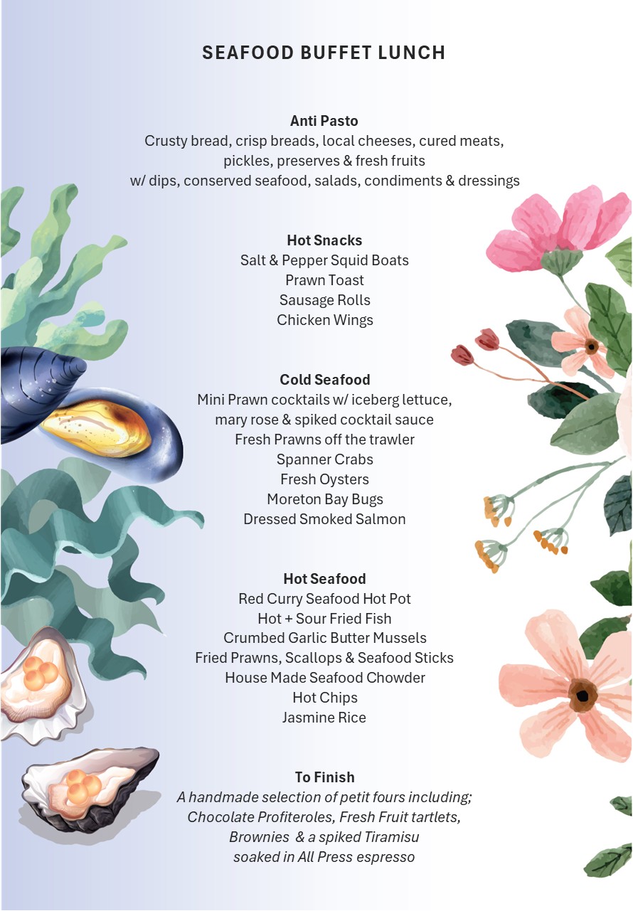From midday, indulge in a premium buffet featuring fresh seafood and coastal classics.