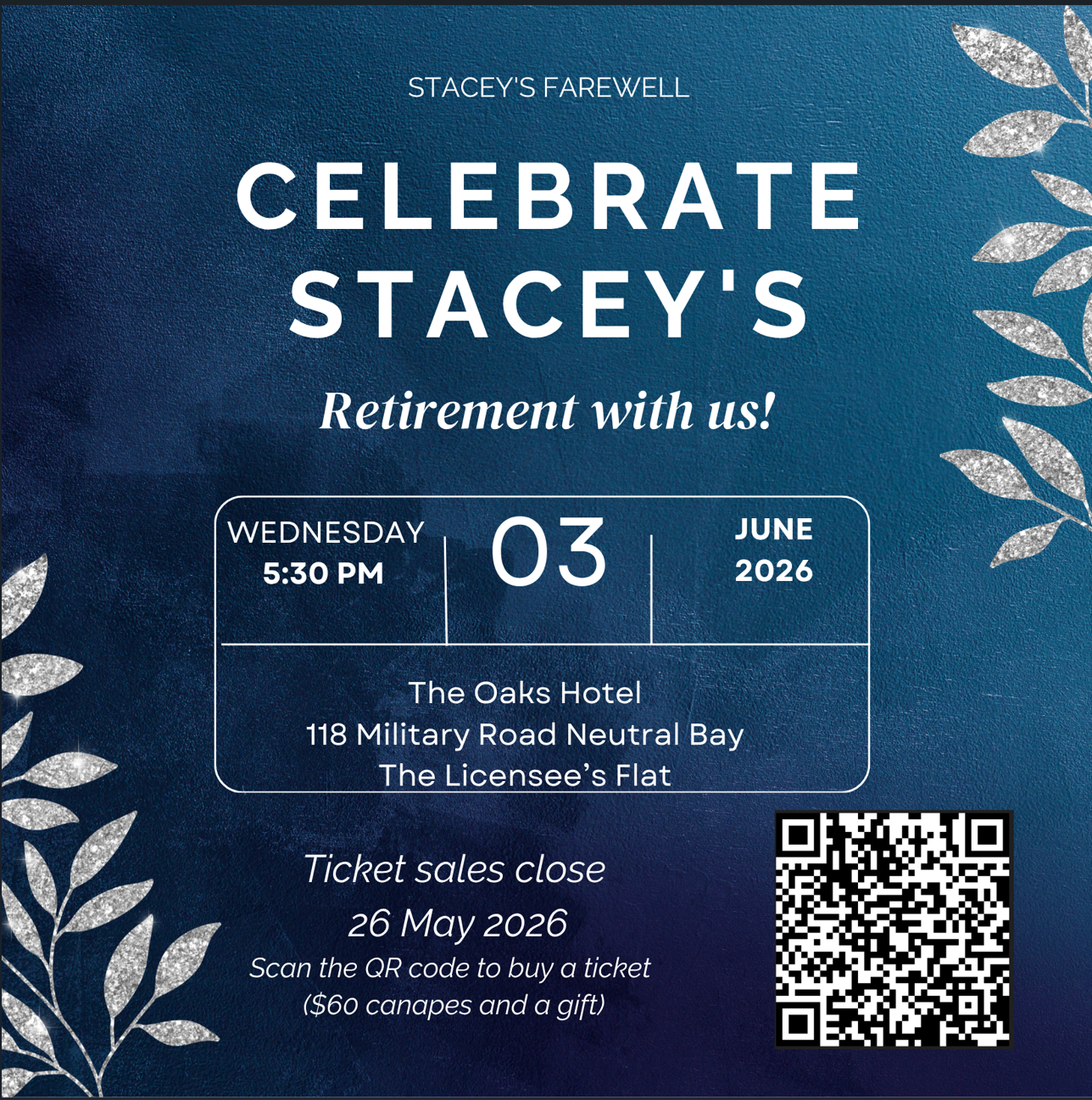 Please note that the $60 ticket cost will cover canapes and a gift for Stacey. The formal speeches will be at approximately 6pm.