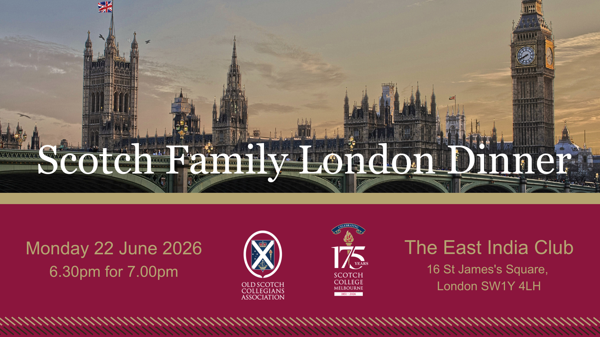 2026 Scotch Family London DinnerOld Scotch Collegians, partners and Scotch Family members are invited to dinner at The East India Club in London.