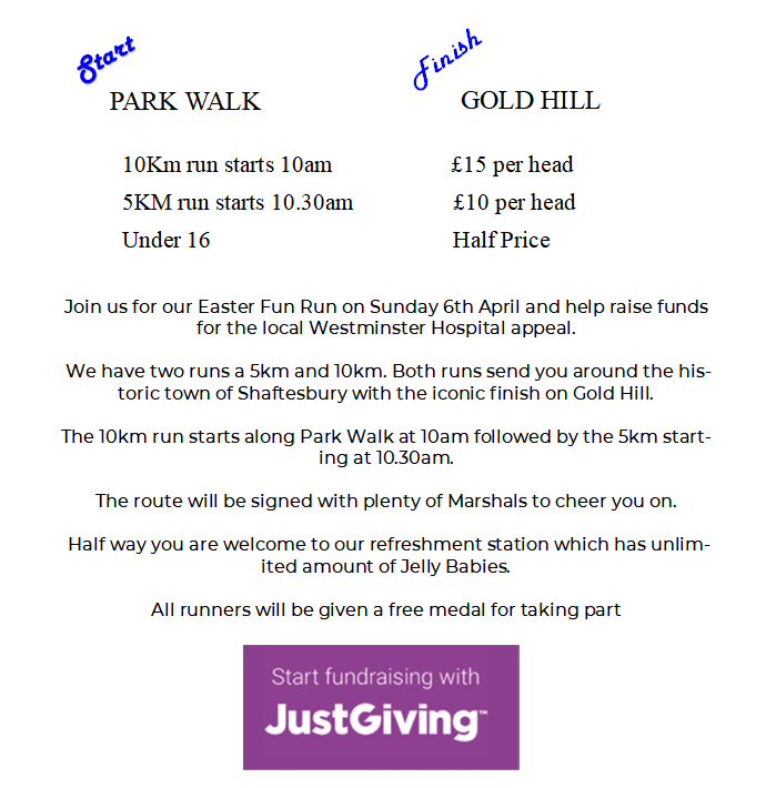 Join us for our Easter Fun Run on Sunday 12th April and help raise funds for the local Westminster Hospital appeal. 2dFor more information www.shaftesburyrotaryclub.org