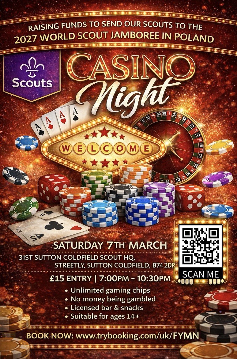 A fun Casino game night for all with unlimited gaming chips included, a licensed bar and snacks available.All to raise funds to support our Sutton Coldfield West representatives going to the 2027 World Scout Jamboree in Poland.