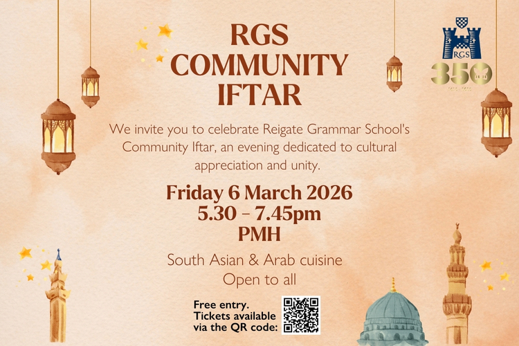 We invite you to celebrate Reigate Grammar School's Community Iftar, an evening dedicated to cultural appreciation and unity. Iftar is the evening meal shared by Muslims to break their fast at sunset during Ramadan. This tradition of coming together with family and friends is a time of gratitude, reflection and community.Whether you are familiar with Iftar or this is your first experience, we warmly welcome all students, staff, families and friends to join us for an evening of cultural appreciation and delicious food. Enjoy a selection of South Asian and Arab cuisine as we celebrate this special occasion together.