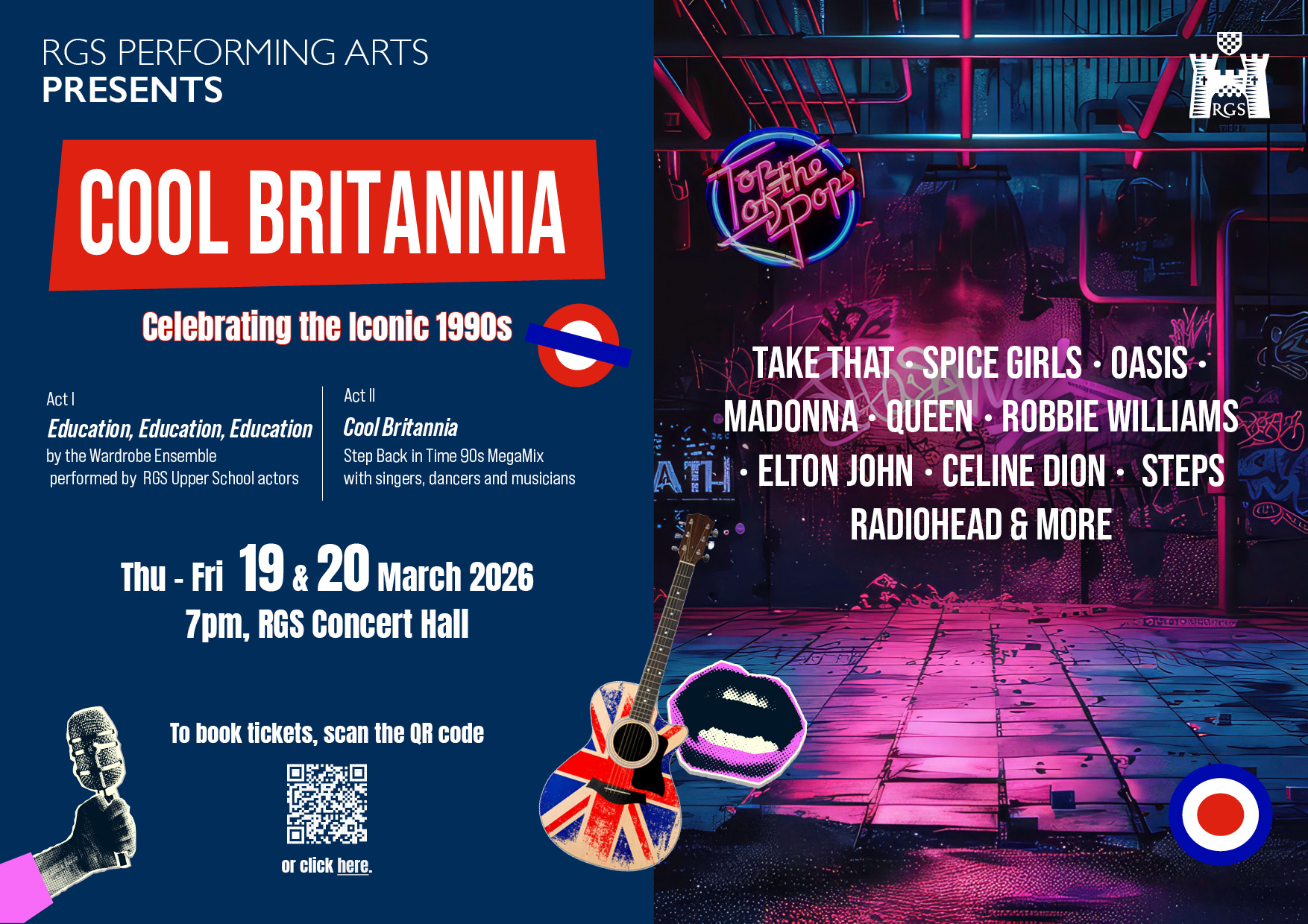 Cool Britannia is Reigate Grammar School’s first-ever combined Performing Arts spectacular — and it’s set to be unforgettable!This electrifying evening celebrates the very best of the Music and Drama departments while bringing back a decade history seems to have forgotten: the iconic 1990s.