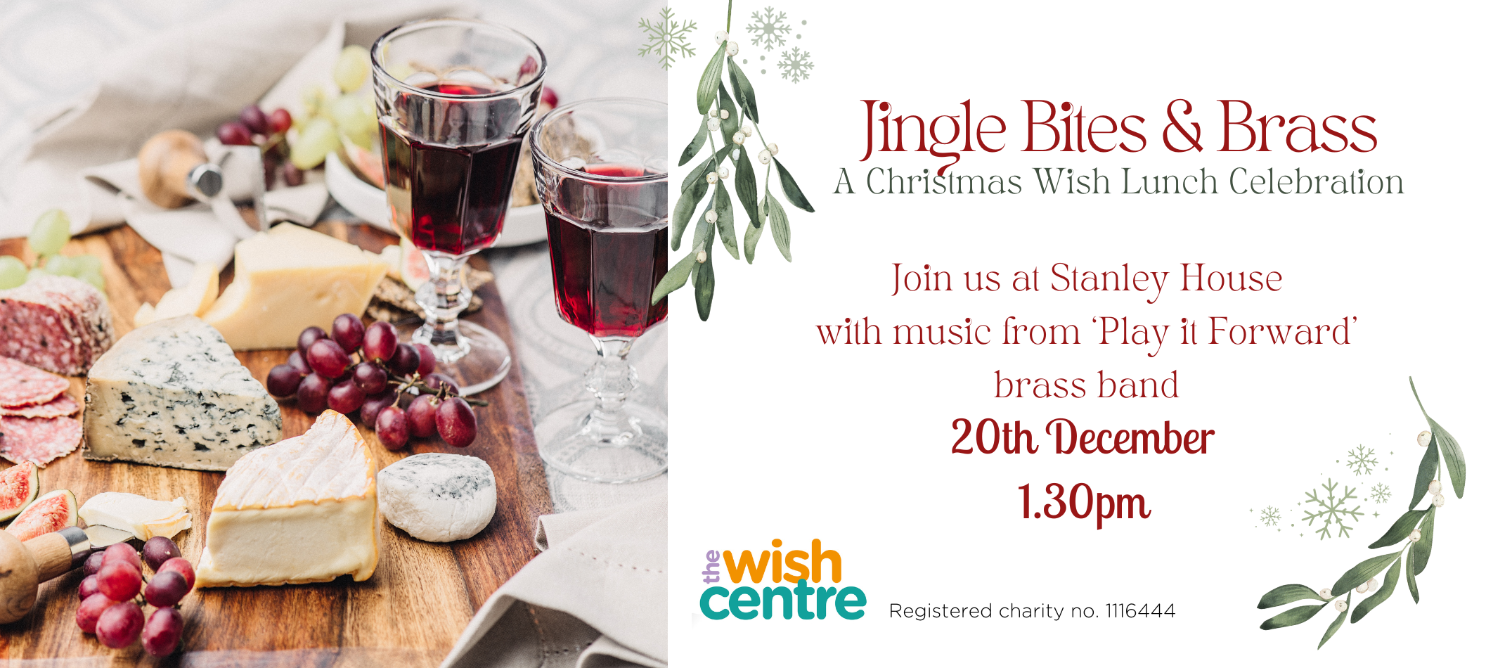 Join us for a heart-warming Christmas lunch that includes a cheese platter and mulled wine, whilst listening to the festive tunes played by Play It Forward Brass Band.Every ticket purchased helps make the season brighter for those who need the support of The Wish Centre.